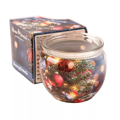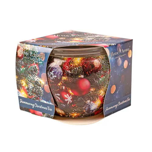 Brad strălucitor de Crăciun, lumânare parfumată, pahar