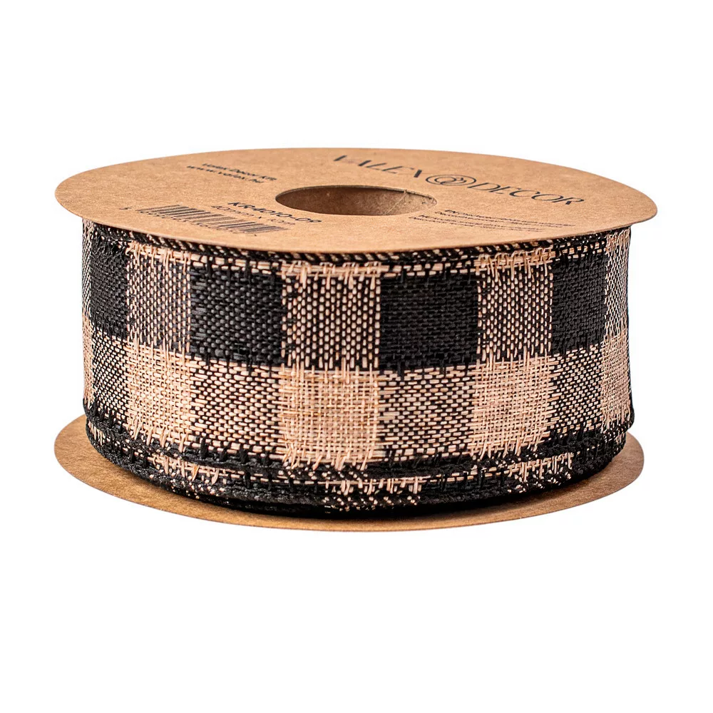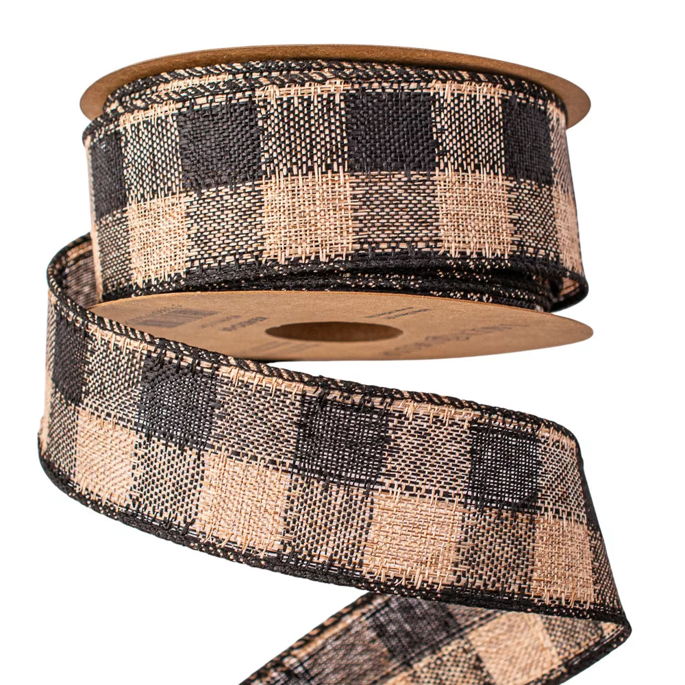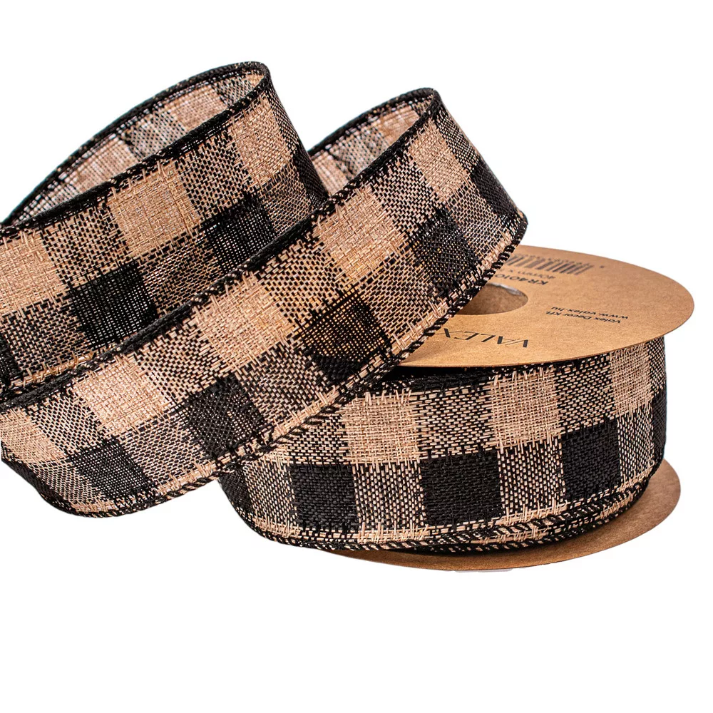 Panglică din pânză cu carouri și margine sârmă 40mm x 10m - Negru/Ecru