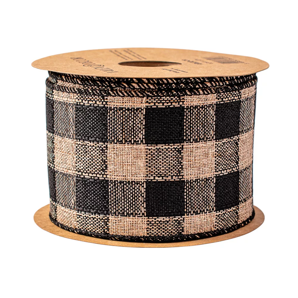 Panglică din pânză cu carouri și margine sârmă 63mm x 10m - Negru/Ecru