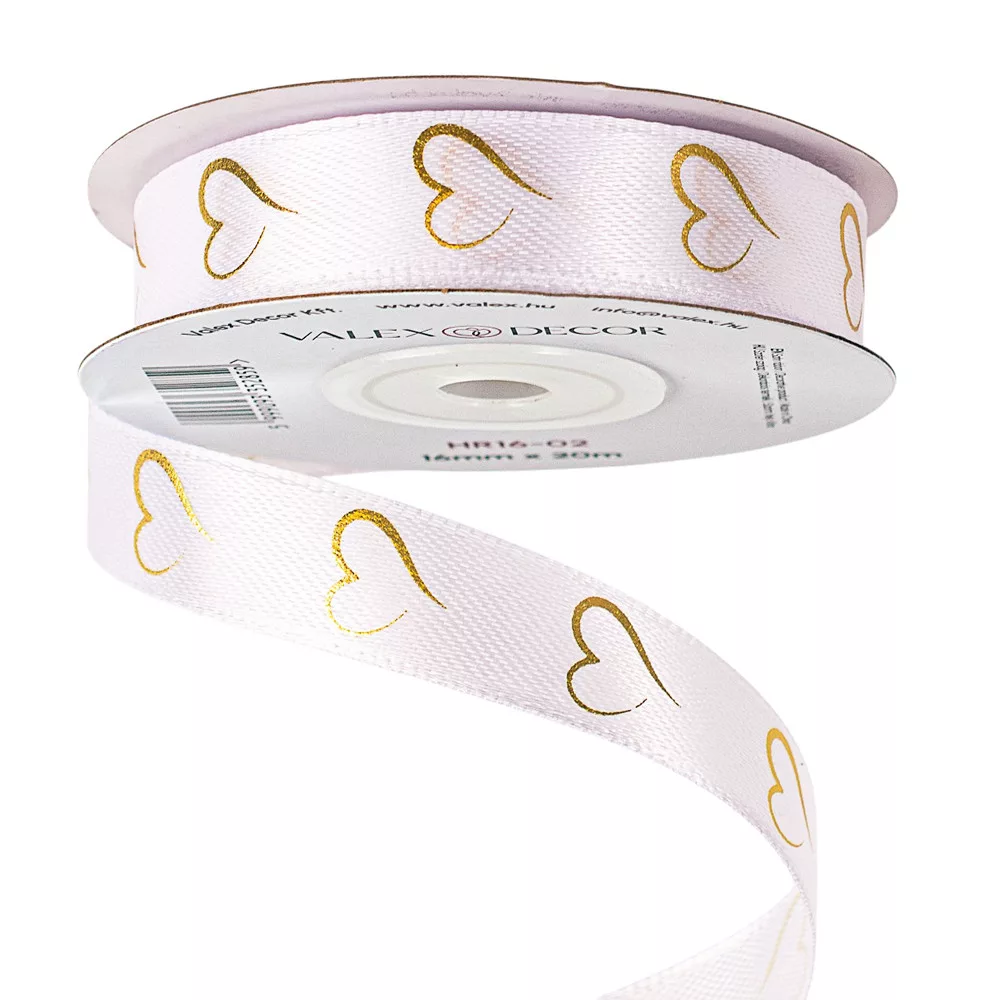 Panglică satinată albă cu inimioare aurii 16mm x 20m - Alb