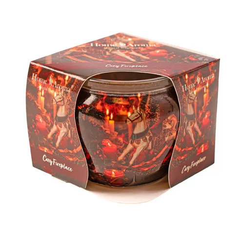 Șemineu confortabil, lumânare parfumată, pahar