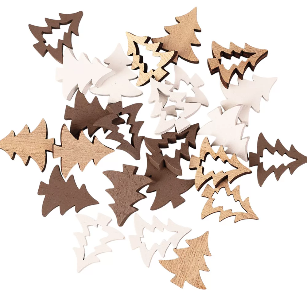 Set decorațiuni Crăciun, brazi din lemn, 2.5cm, 24 buc - Mix maro/alb