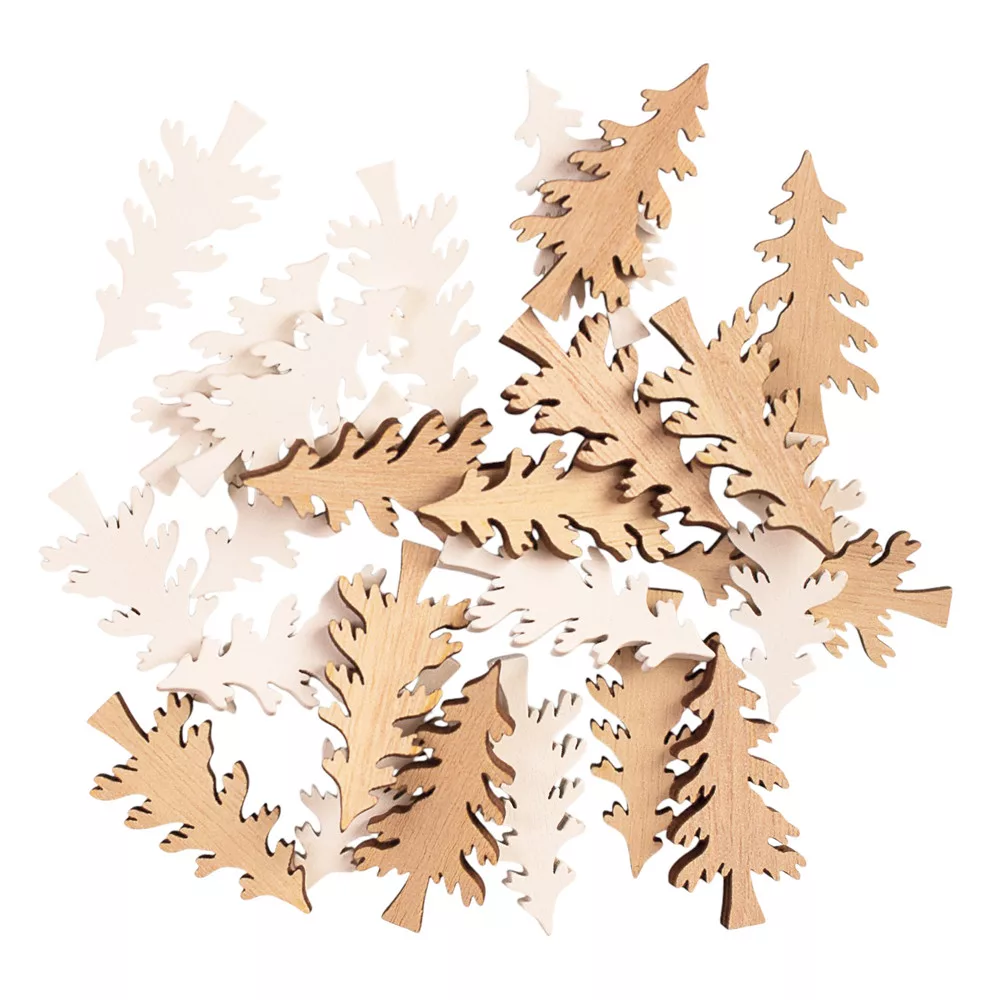 Set decorațiuni Crăciun, brazi din lemn, 4.5 x 2cm, 24 buc - Mix natur/alb